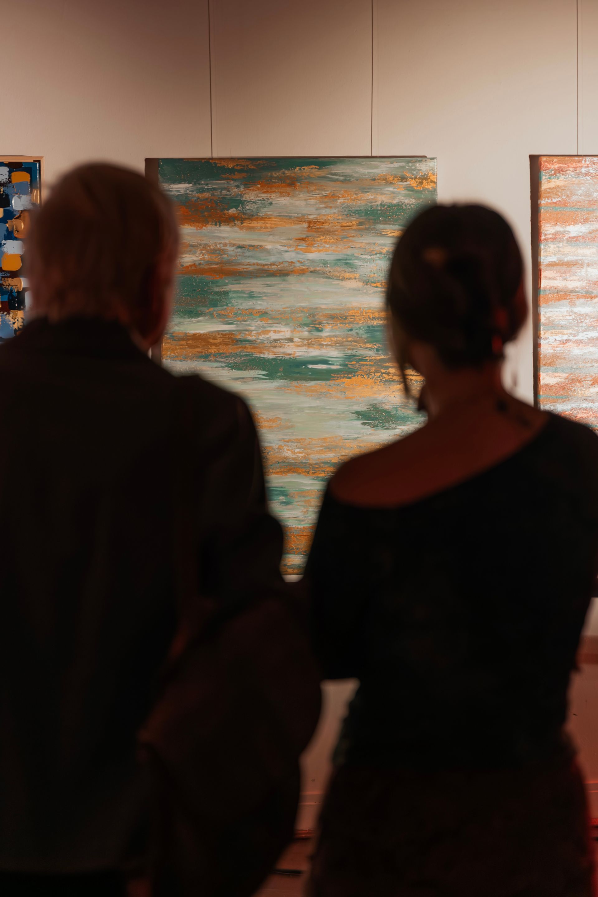 The palette of the painting draws inspiration from the beach, the ocean, and the rich hues of sunsets. Among these colors, warm gold accents evoke the sun's shimmering reflection on the water as it sinks into the horizon.