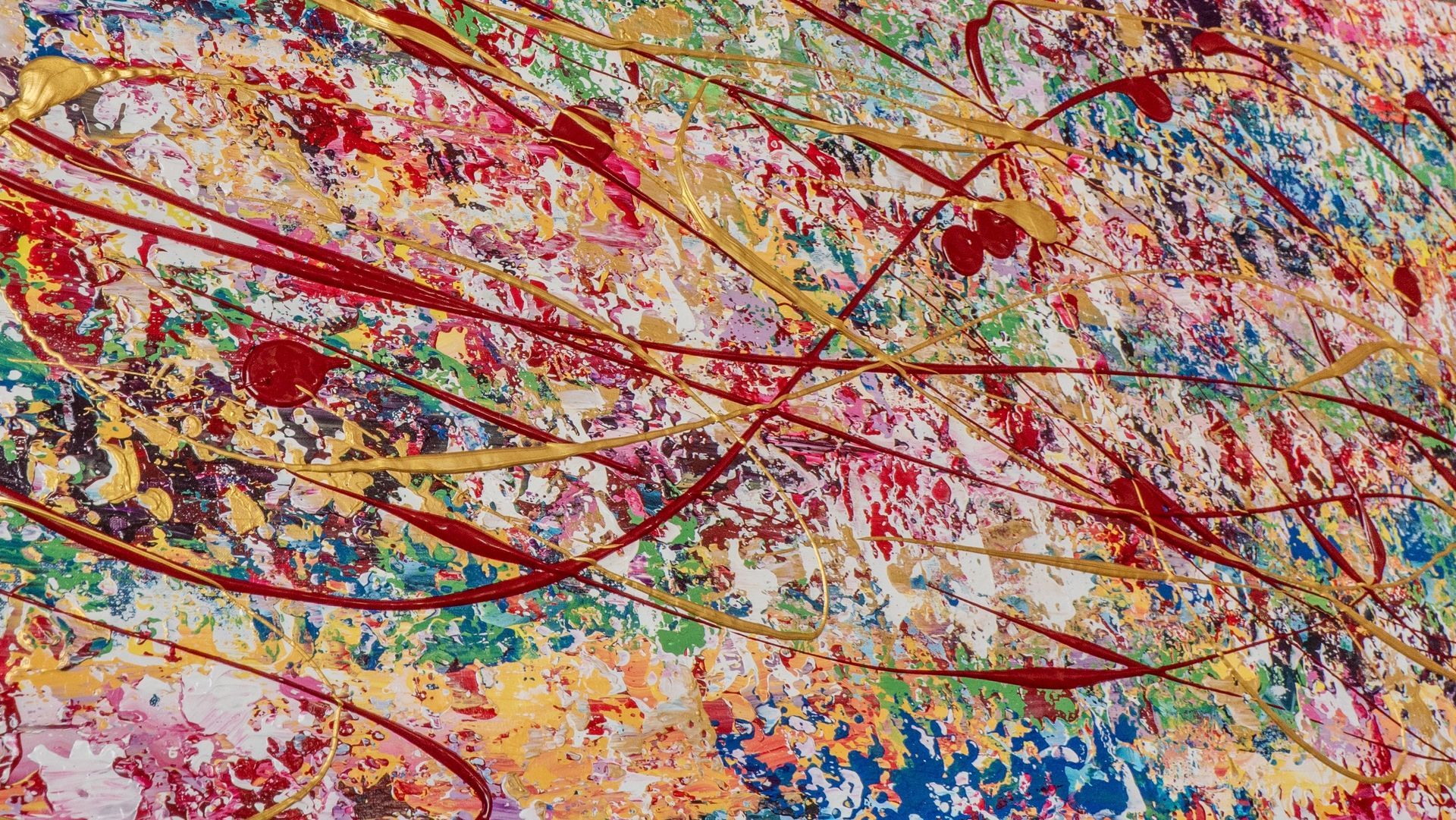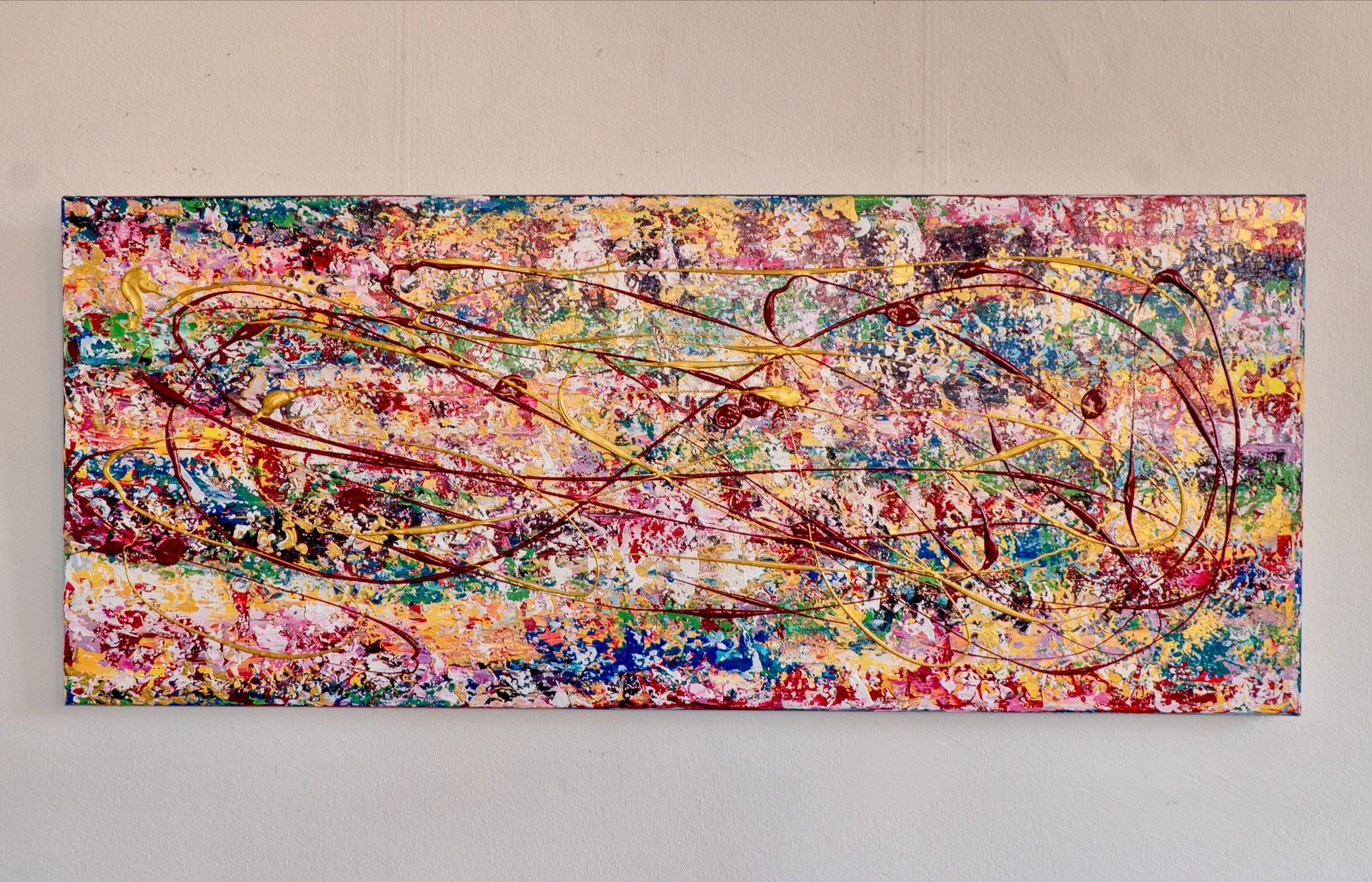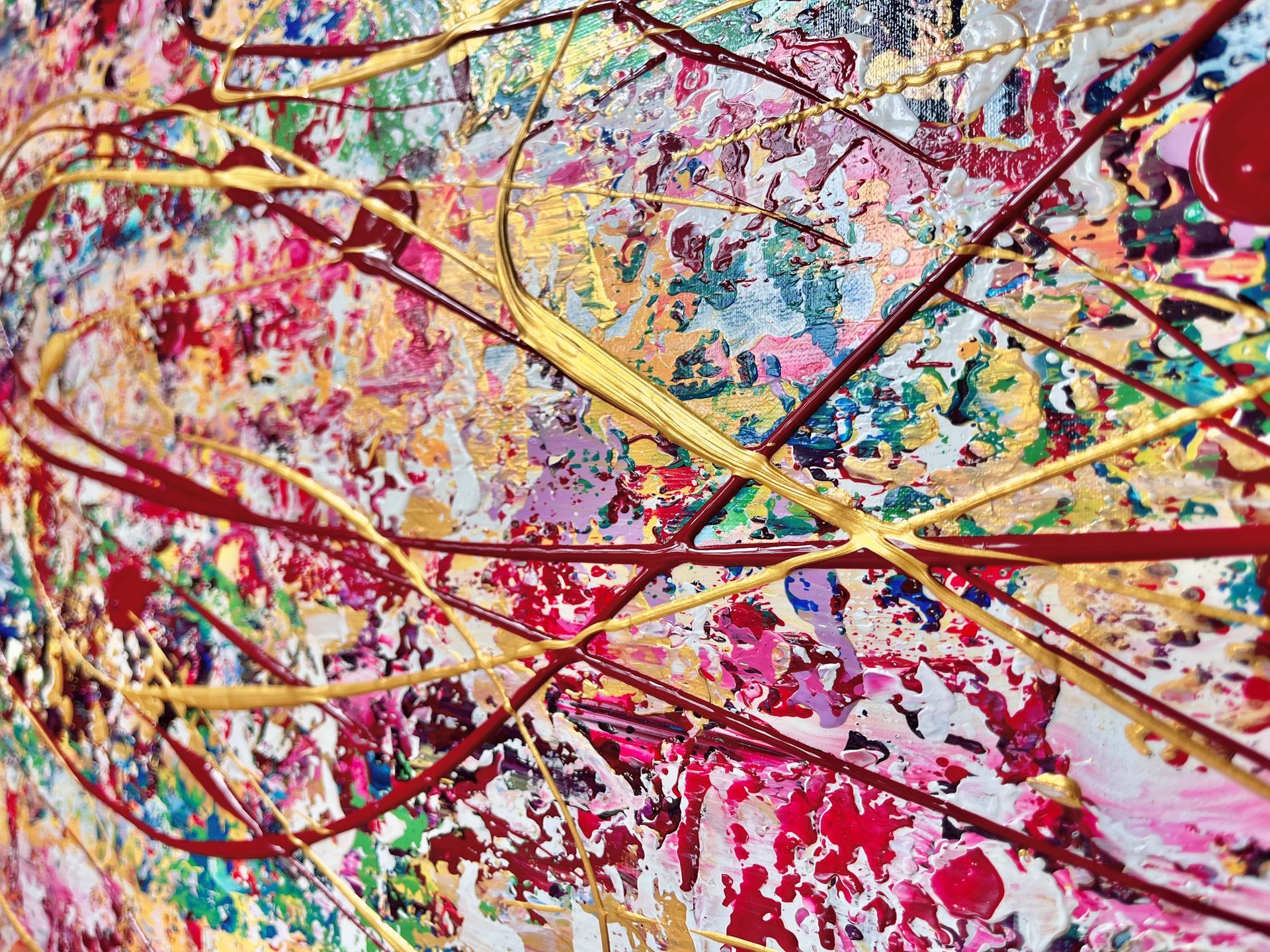 Every color imaginable is captured in this artwork—an homage to the spectrum and a declaration that not everything needs to be color-coordinated. A harmonious mix of greens, blues, pinks, reds, golds, and everything in between. Intertwined with the pink and gold that unifies the vibrant chaos into a single masterpiece. This striking piece would dominate a space with minimal color or create an eye-catching focal point in a room bursting with hues. A true showstopper.