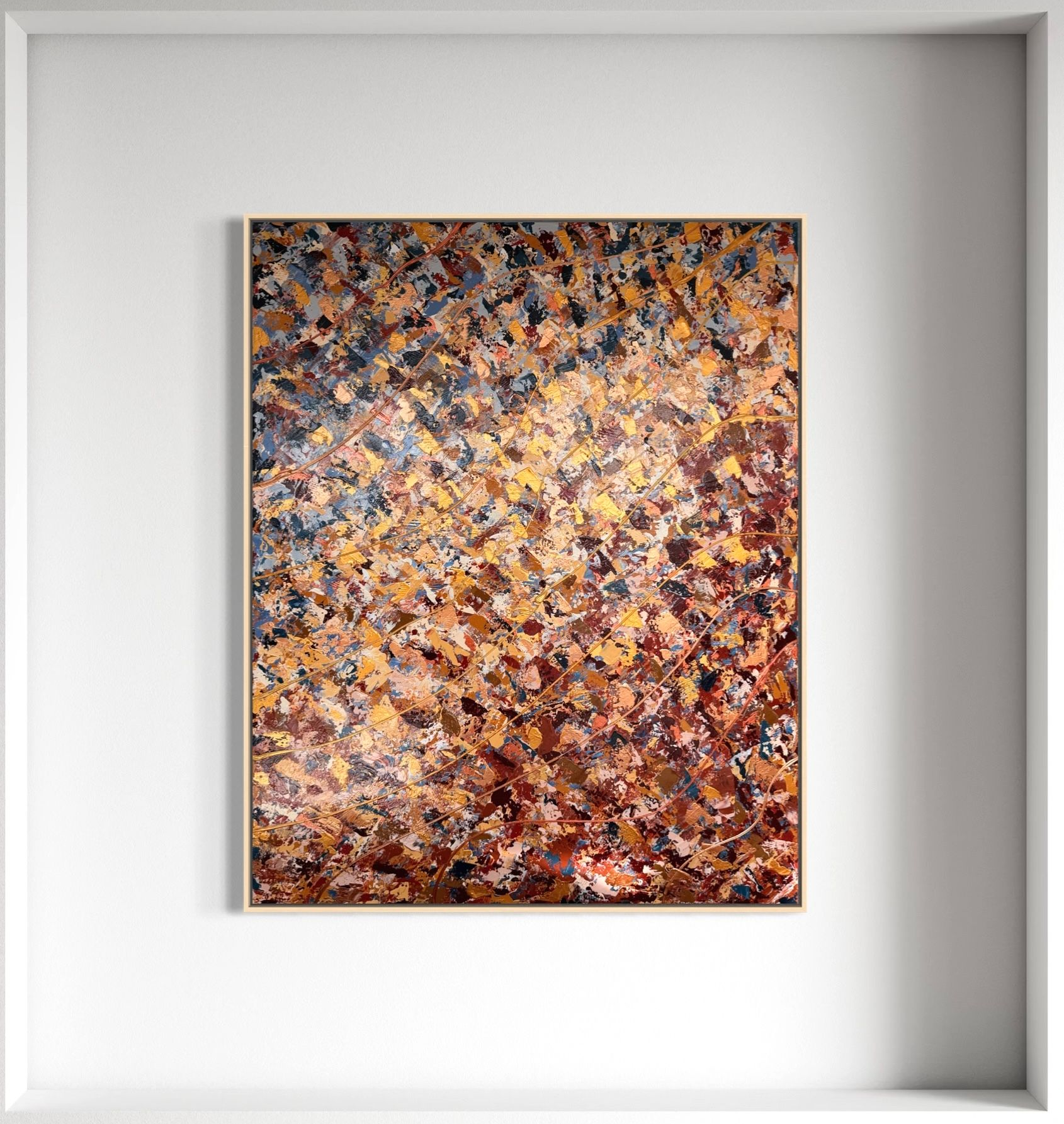 Every morning, I would come up to my studio and watch the sunrise. Hues of blue, pink, red, orange and yellow beamed into my studio, hitting the wall. This gave me an instant inspiration. My goal was to put those gradient colours on a canvas. To capture the night going into day. From dark blues, to deep reds and golden sun rays.