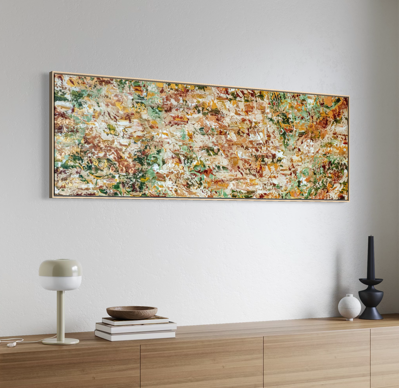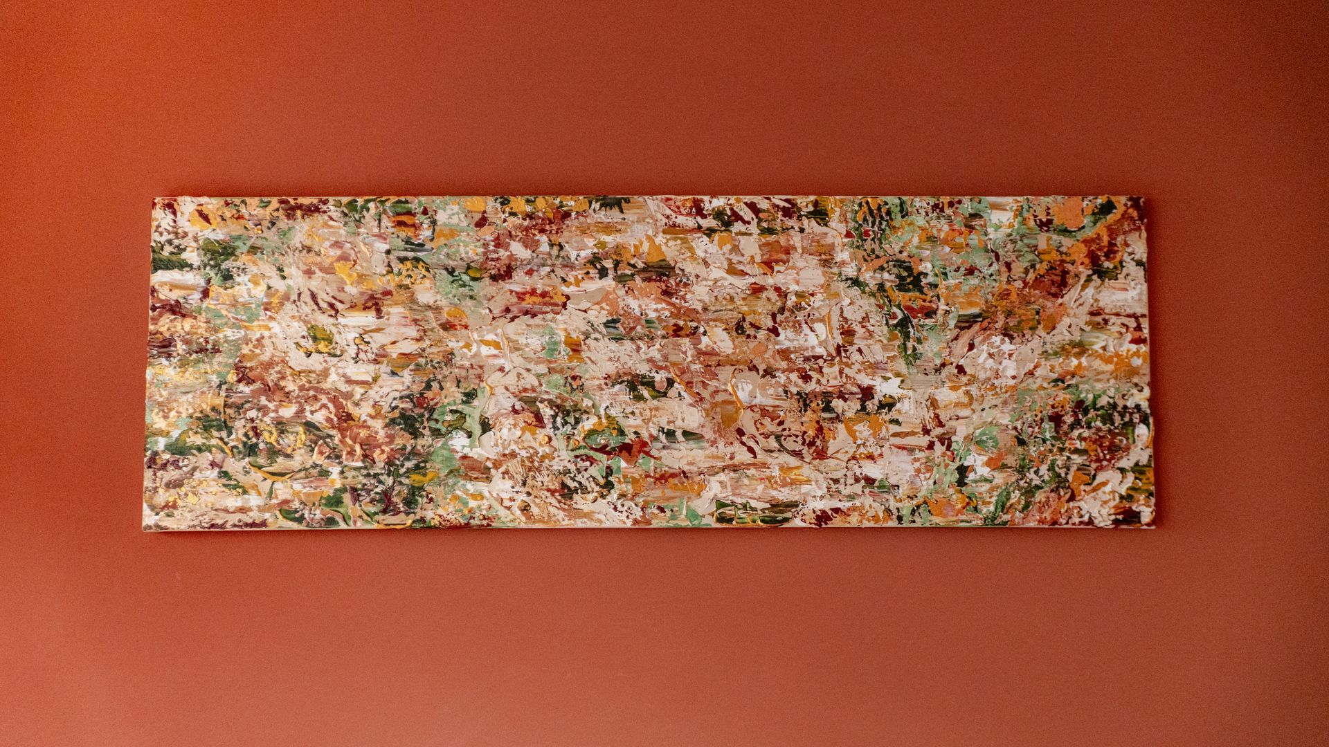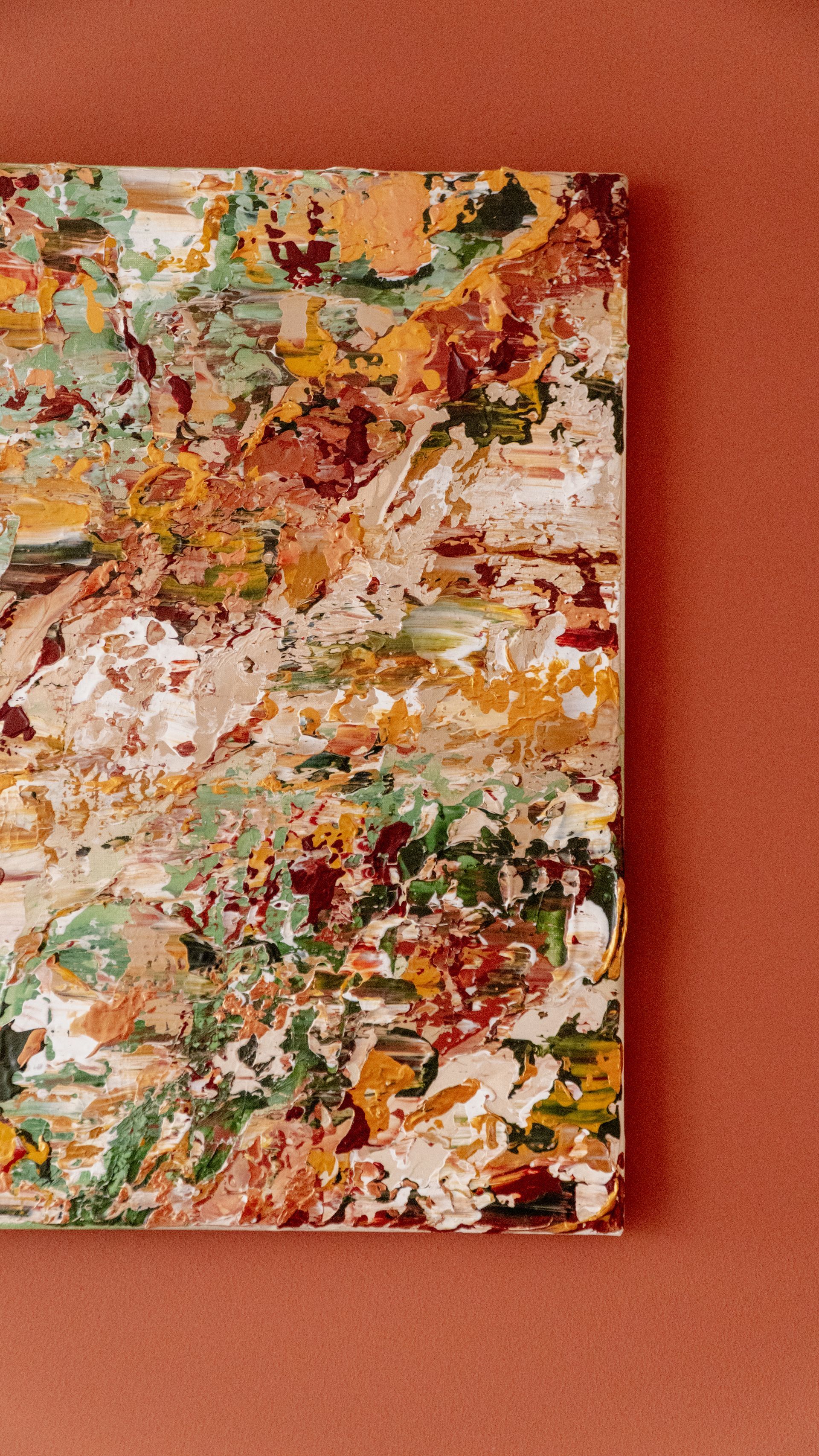 Inspired by the Redwood, New Zealand, this piece was created with the feeling of having your eyes closed and feeling the light of sunlight through a canopy on them. The tranquility and calm, the warmth and cold breezes under the roof of leaves. With golden touches, this artwork truly changes during the day, with the light.