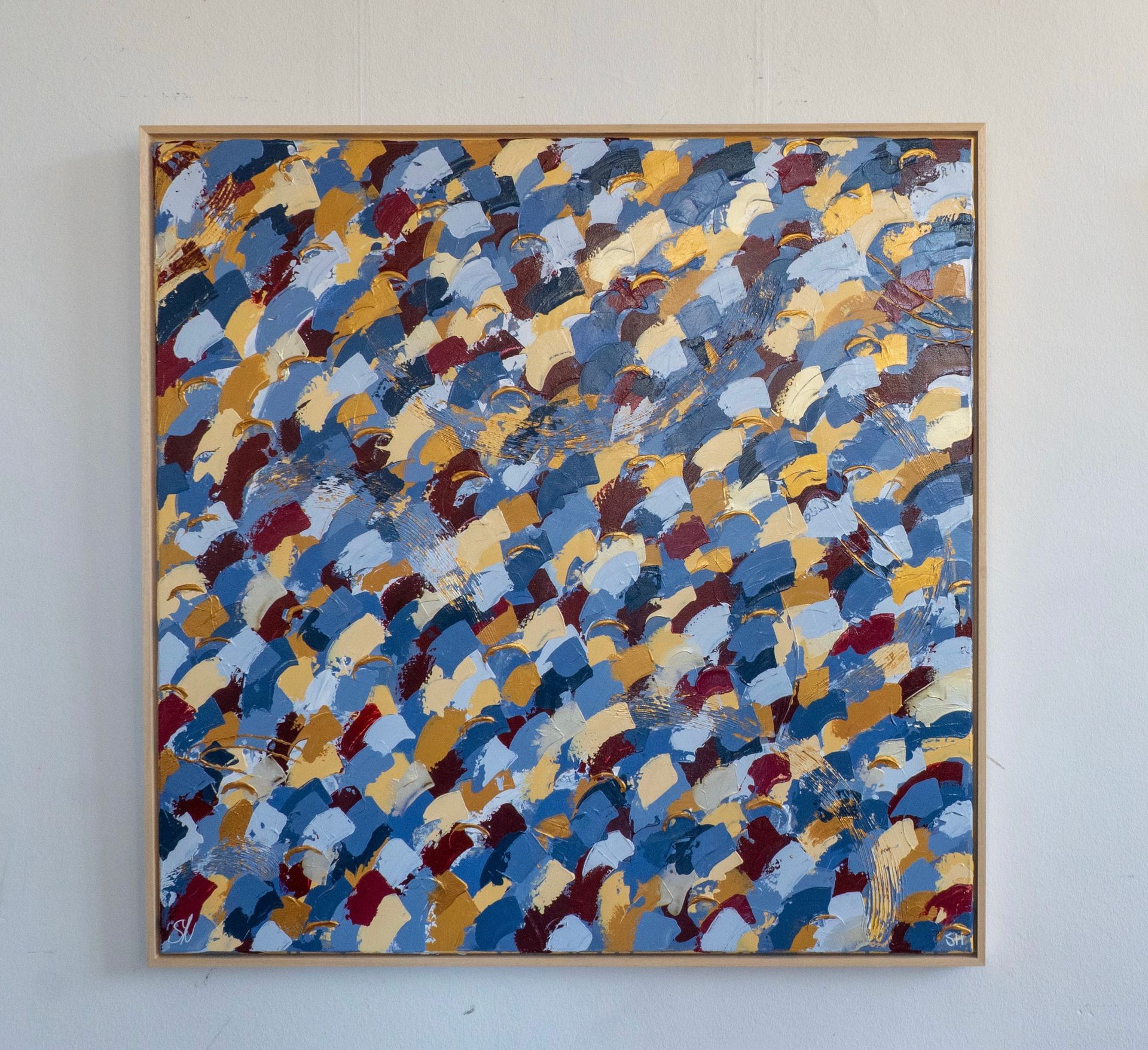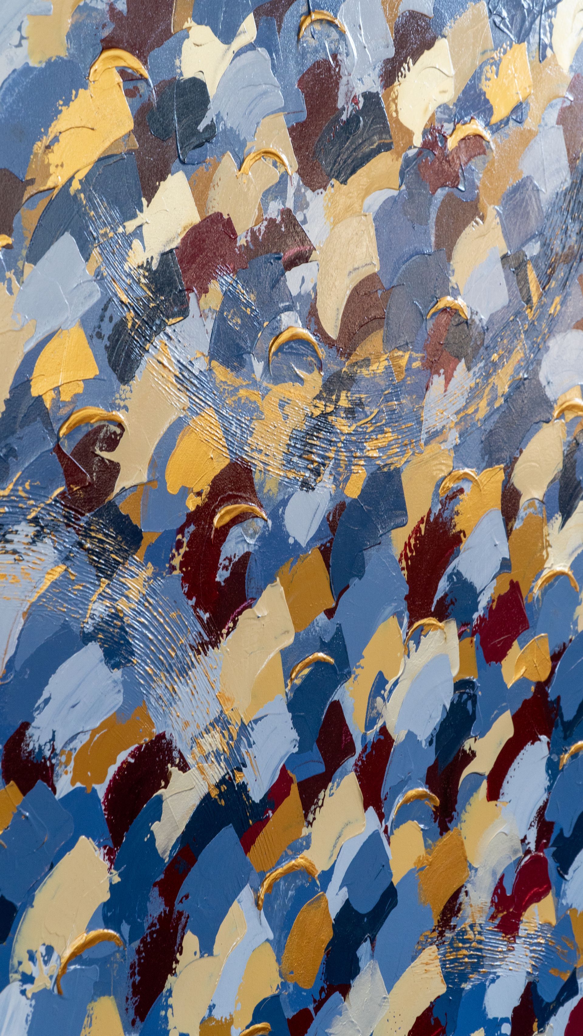This piece was crafted during a sweltering summer, with many days spent at the beach near Haarlem, where Sigrid’s studio is located. Here, she observed paragliders soaring over the dunes, lifted by the winds as the heat intensified and thermal currents swelled. The palette of the painting draws inspiration from the beach, the ocean, and the rich hues of sunsets. Among these colors, warm gold accents evoke the sun's shimmering reflection on the water as it sinks into the horizon.