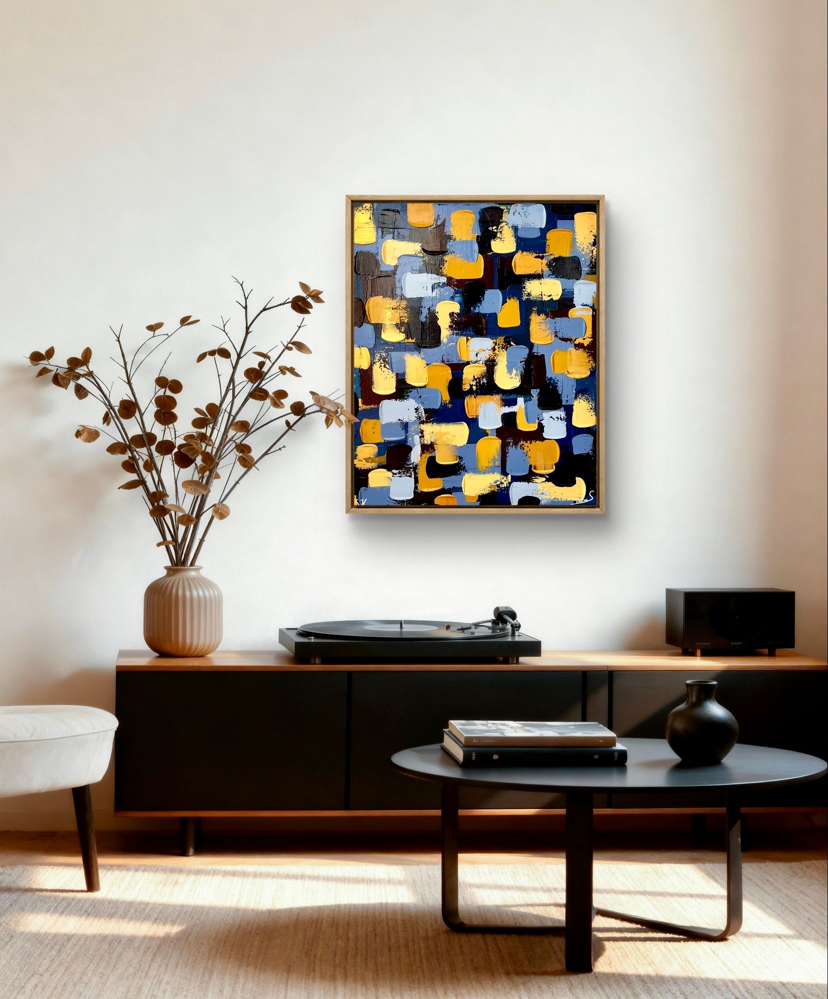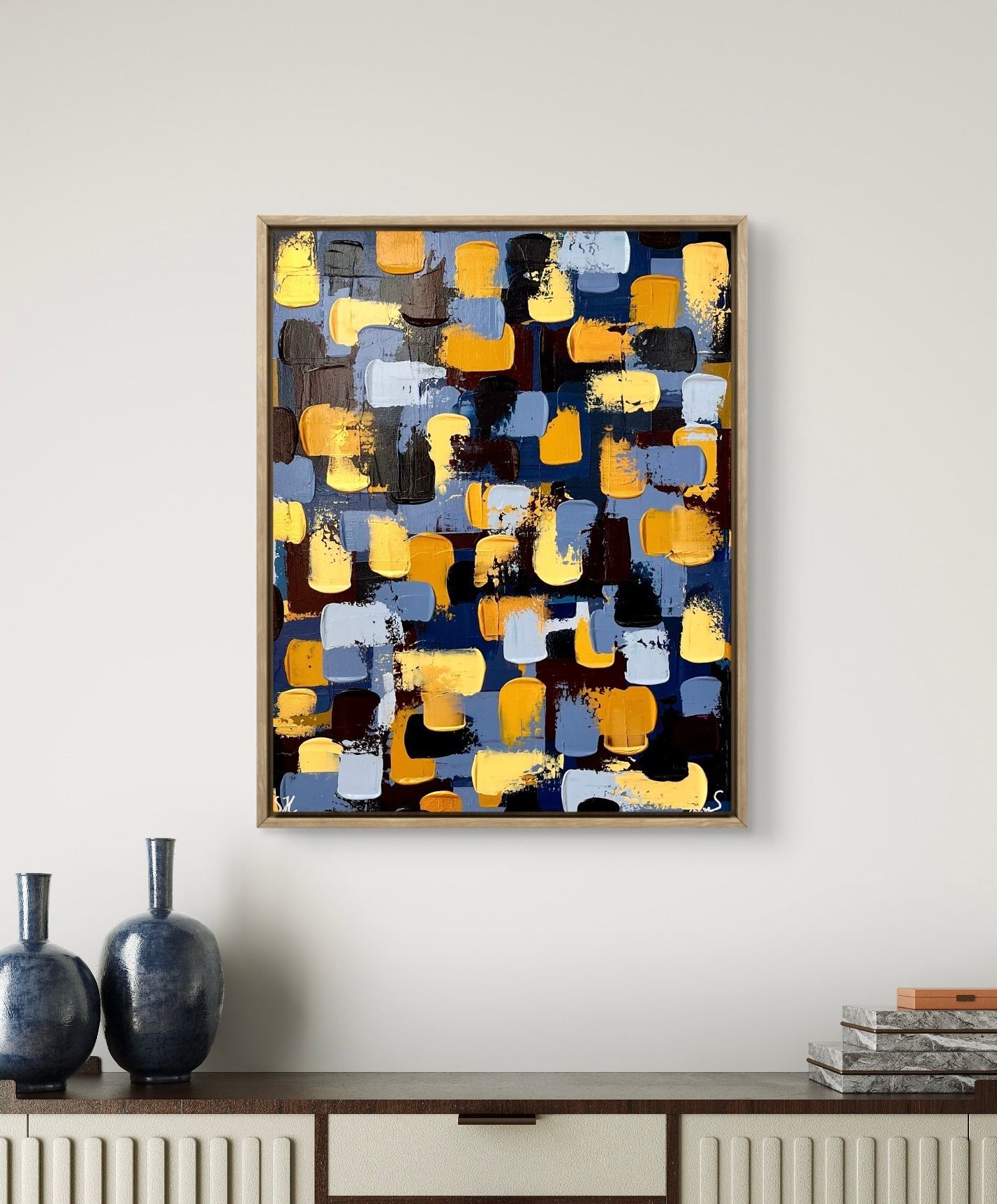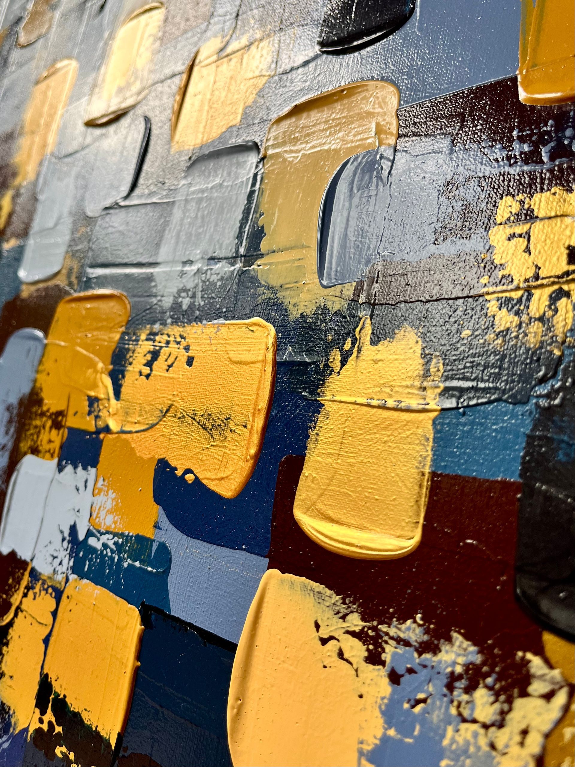 The darker colours in the background are inspired by the feeling of being overwhelmed. Slowly the colours start to get brighter and start to compliment each other. The blue of the wind and ocean, the gold, yellow and orange from the sand and sun. Every colour is balanced with the other, just like the sea is with the sand. Let it carry you away and take you to more peaceful places. Calm and chaos beautifully matched.