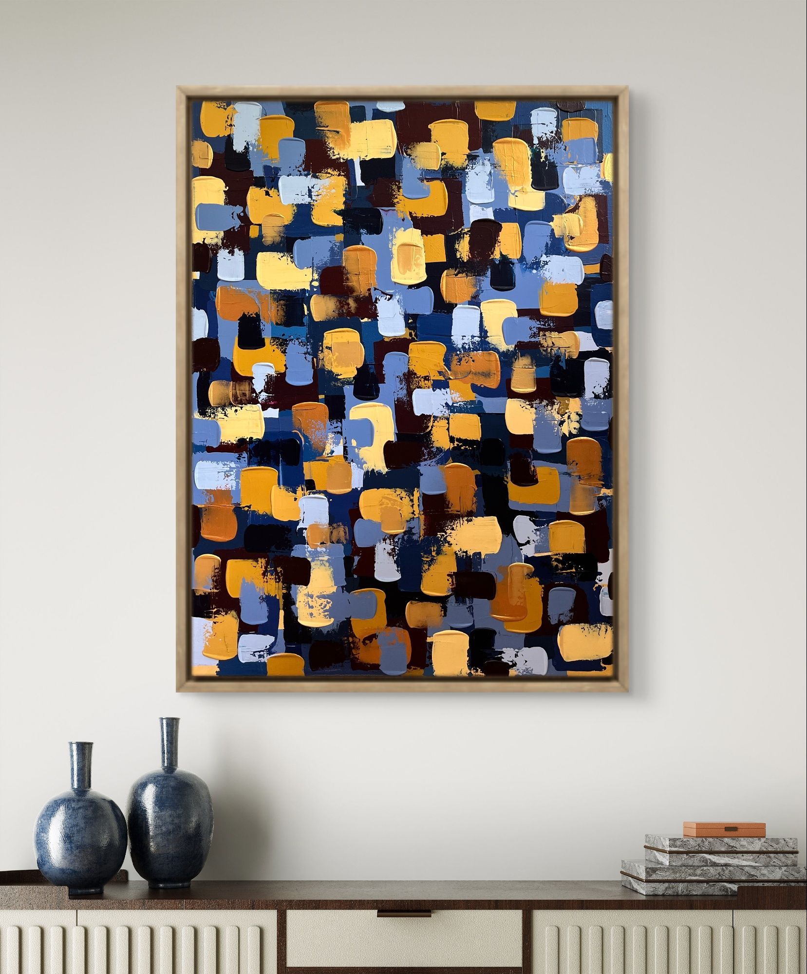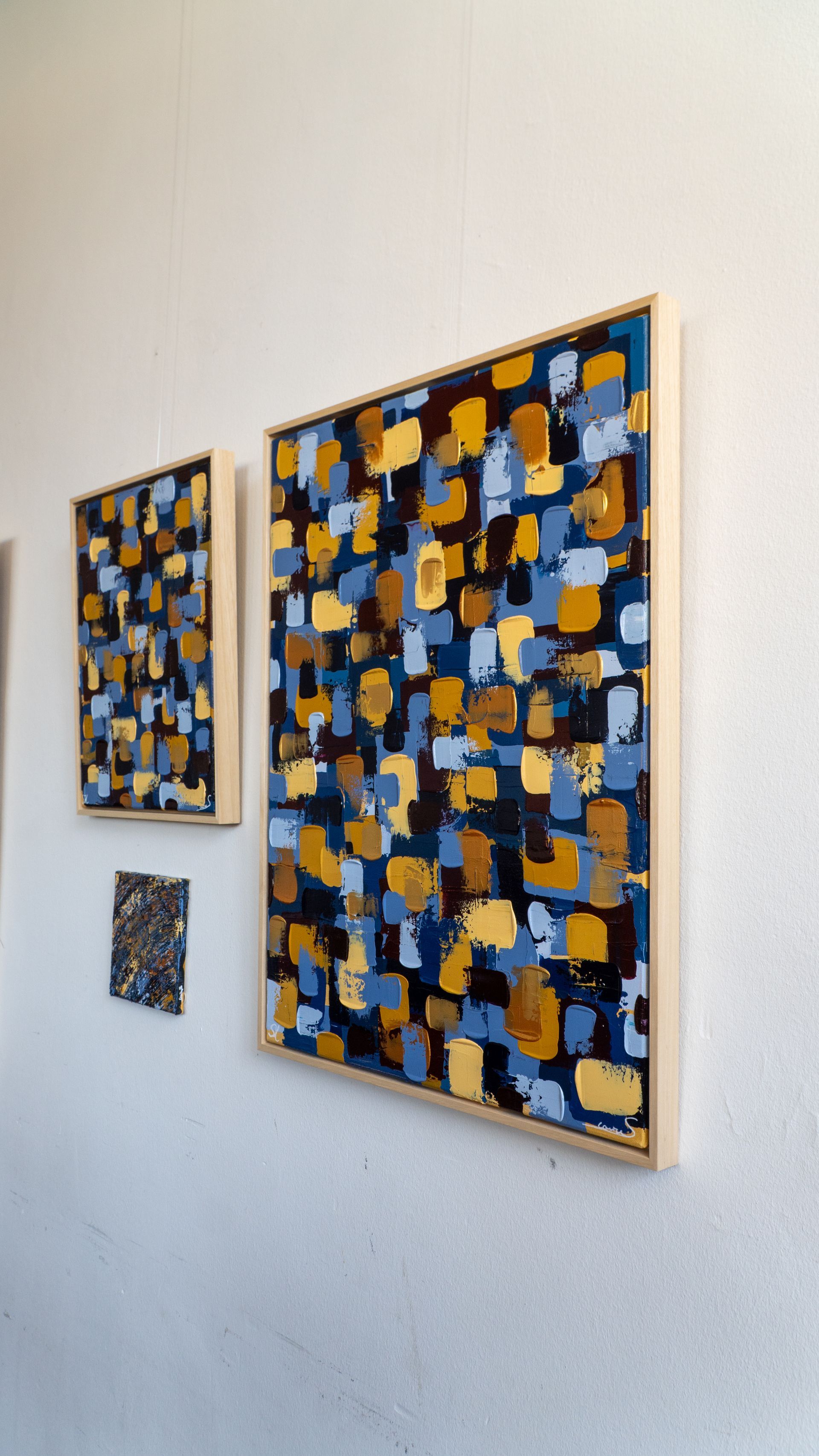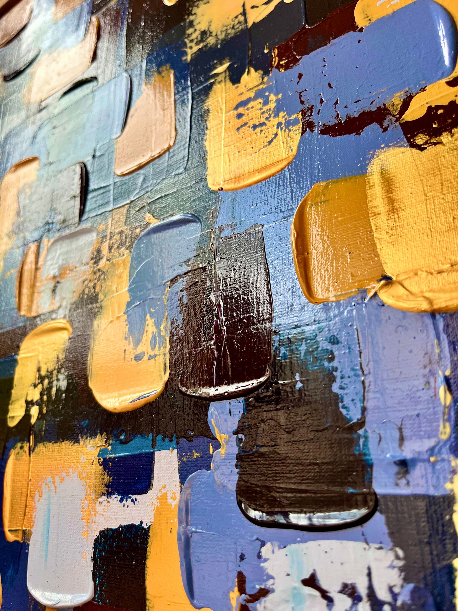 The darker colours in the background are inspired by the feeling of being overwhelmed. Slowly the colours start to get brighter and start to compliment each other. The blue of the wind and ocean, the gold, yellow and orange from the sand and sun. Every colour is balanced with the other, just like the sea is with the sand. Let it carry you away and take you to more peaceful places. Calm and chaos beautifully matched.