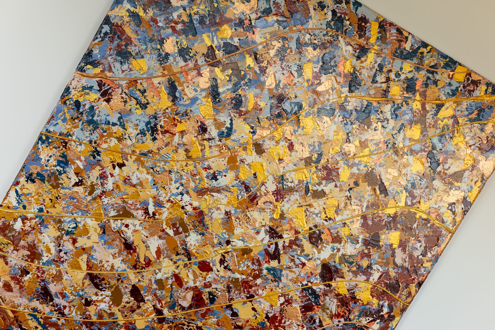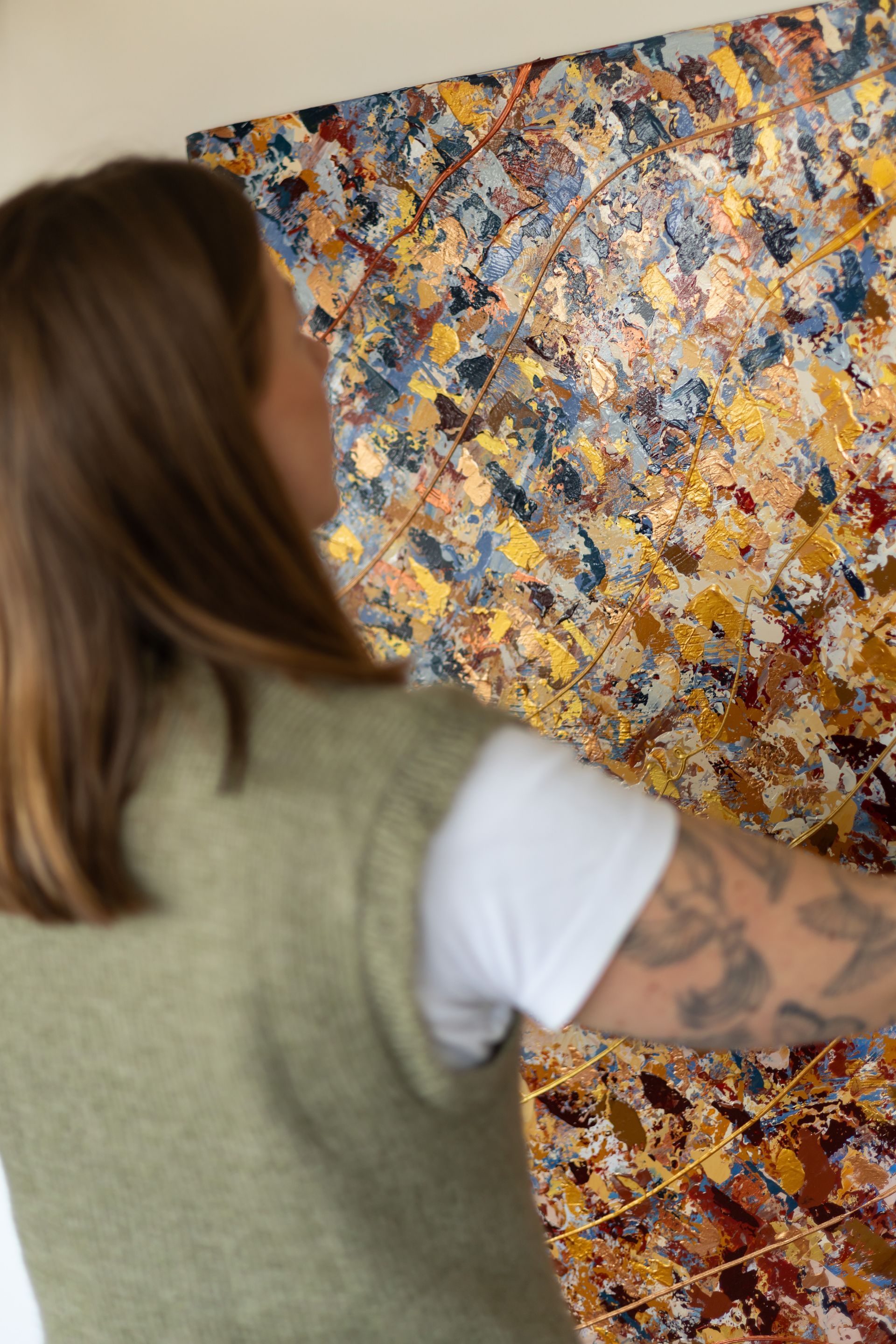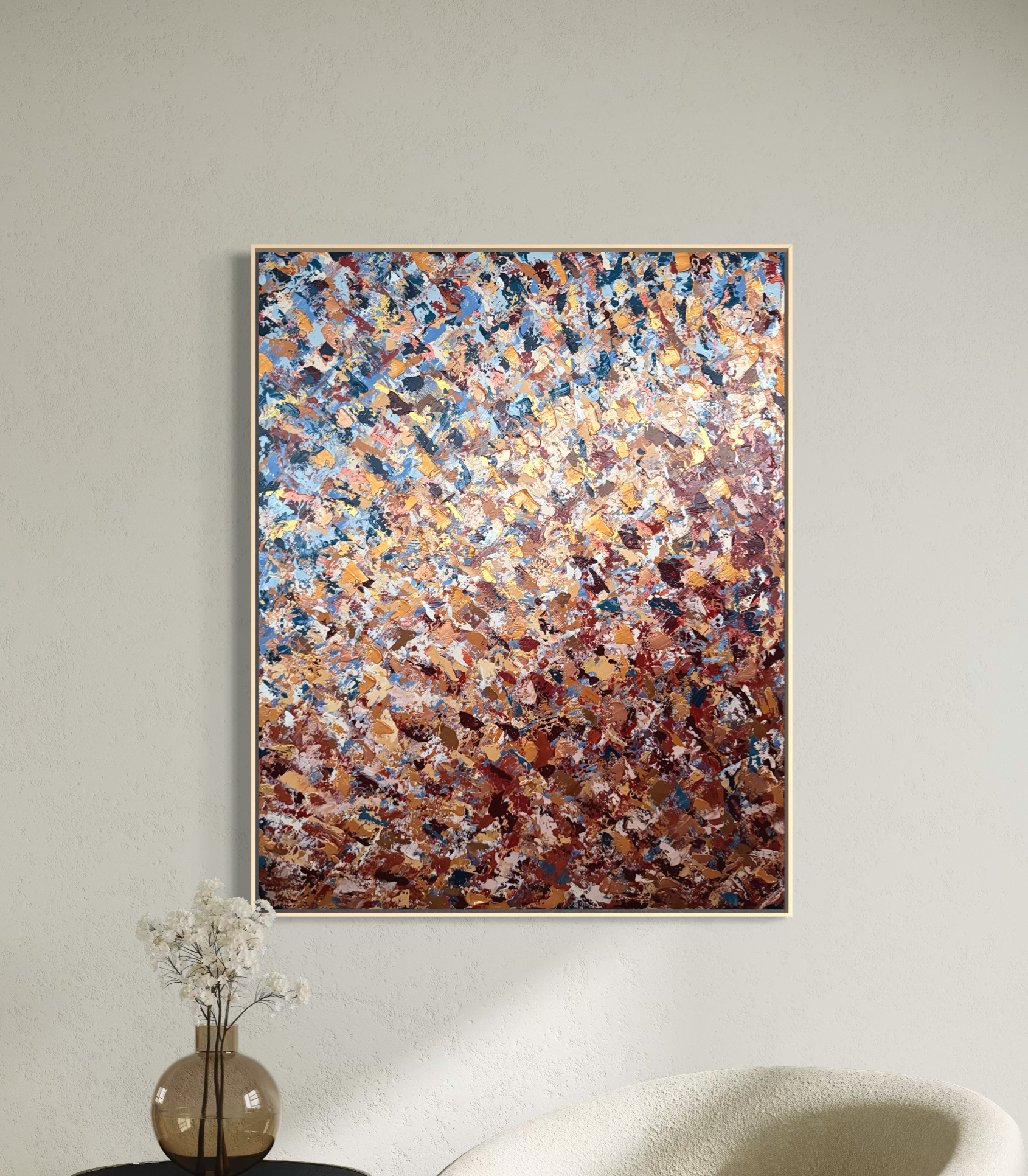Every morning, I would come up to my studio and watch the sunrise. Hues of blue, pink, red, orange and yellow beamed into my studio, hitting the wall. This gave me an instant inspiration. My goal was to put those gradient colours on a canvas. To capture the night going into day. From dark blues, to deep reds and golden sun rays.